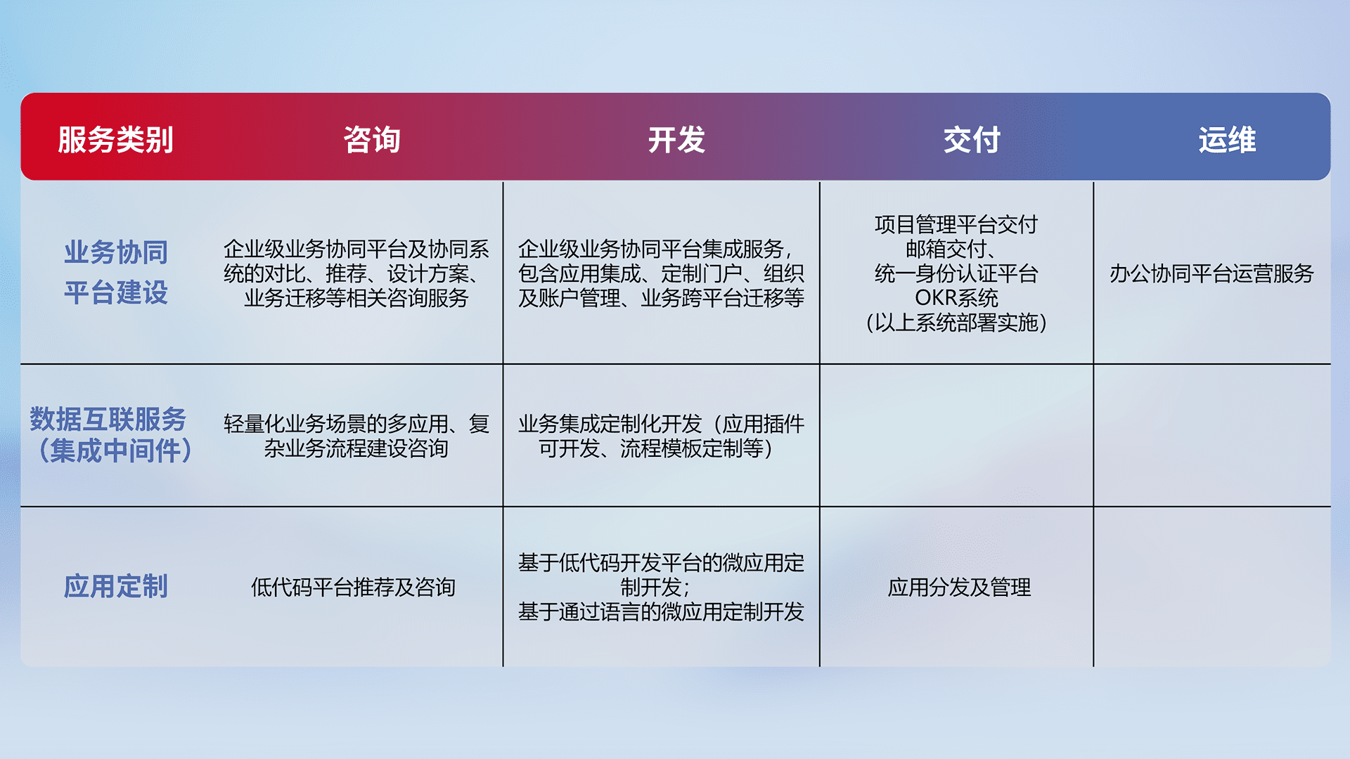 针对钉钉、、企微、、、IDaas等平台级产品提供产品的规划、、、方案、、交付、、、、定制化开发等服务,,,实现如统一协同办公、、智能客户服务、、、、混合会议管理、、、、智能数据查询、、、等业务场景,,,,实现数字化转型。。