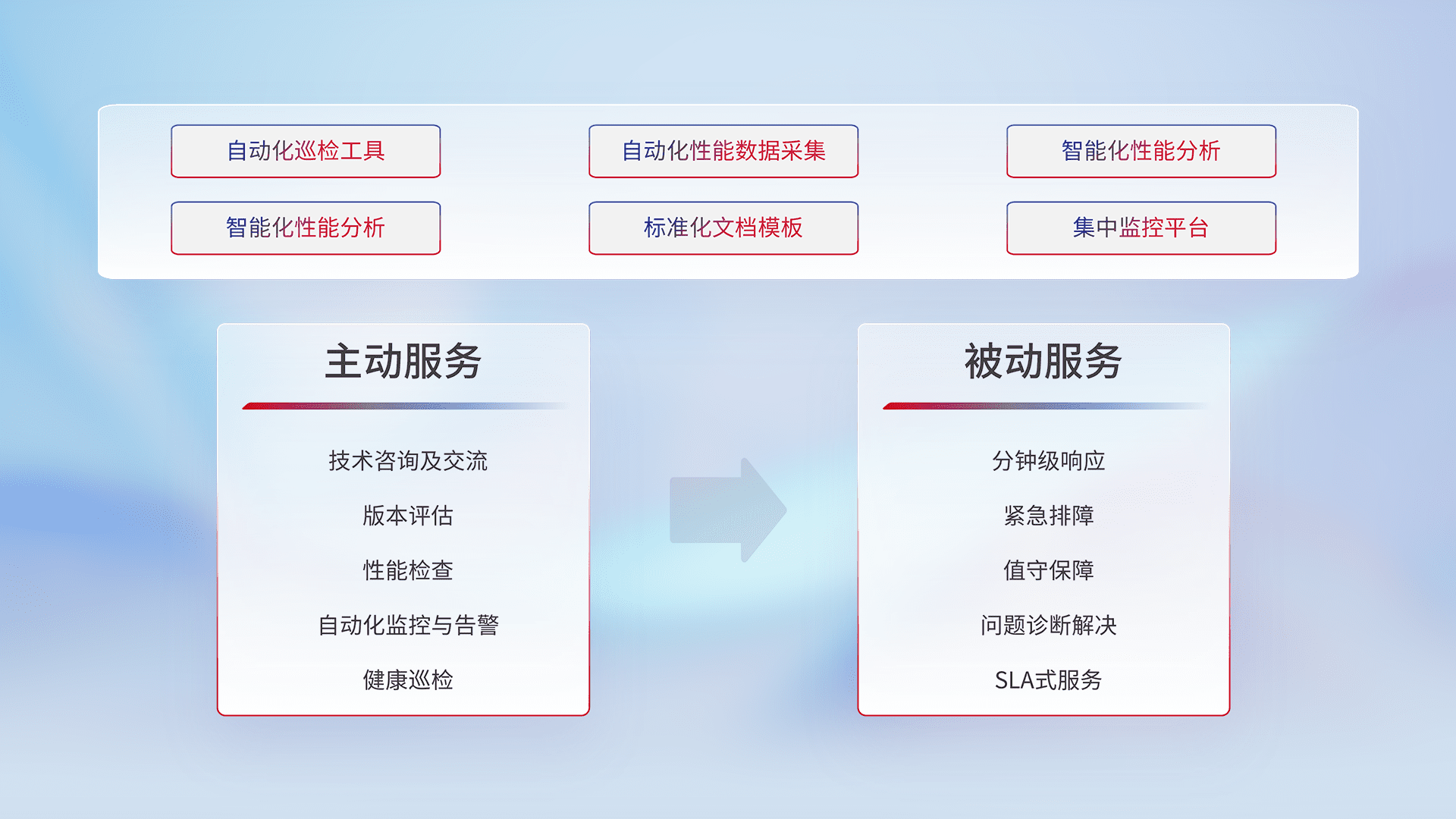 智能化工具和标准化文档,,,保障服务质量,,提供主动服务(包含技术咨询、、版本评估、、性能检查、、自动化监控与告警、、、健康巡检)和被动服务包含(分钟级响应、、紧急排障、、、、值守保障、、问题诊断解决、、、、SLA服务)。。